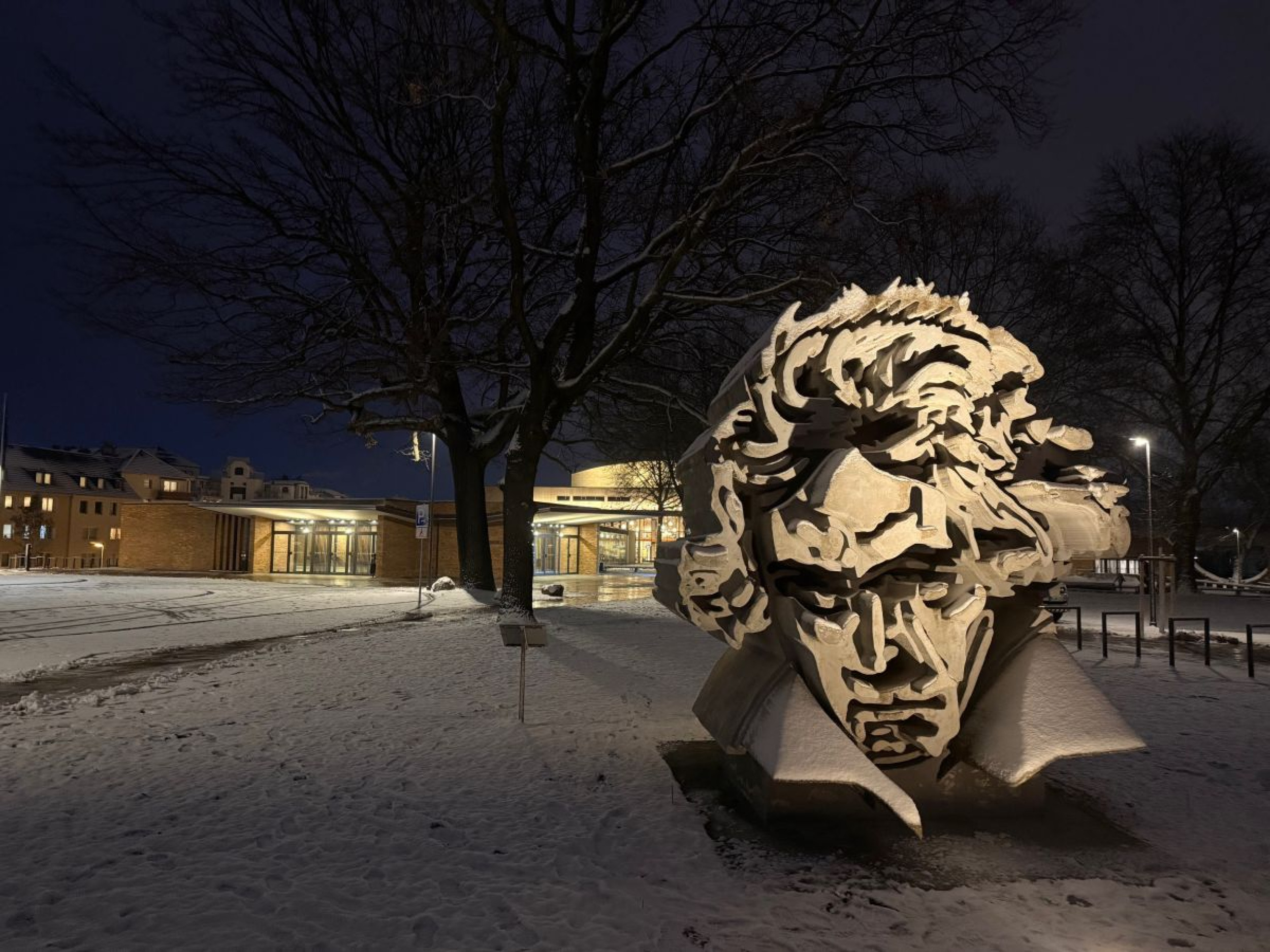 ich hatte eben einen „Rappel“ und musste trotz meines Meniskus-Risses und teils Glatteis zur renovierten Beethovenhalle rüber laufen/schliddern, denn der Beethovenkopf davor (namens BEETHON, da er aus Beton gefertigt ist; er war bei der Errichtung stark umstritten, heute Fotoliebling) ist so selten mit Schnee bedeckt, dass ich Fotos machen musste.